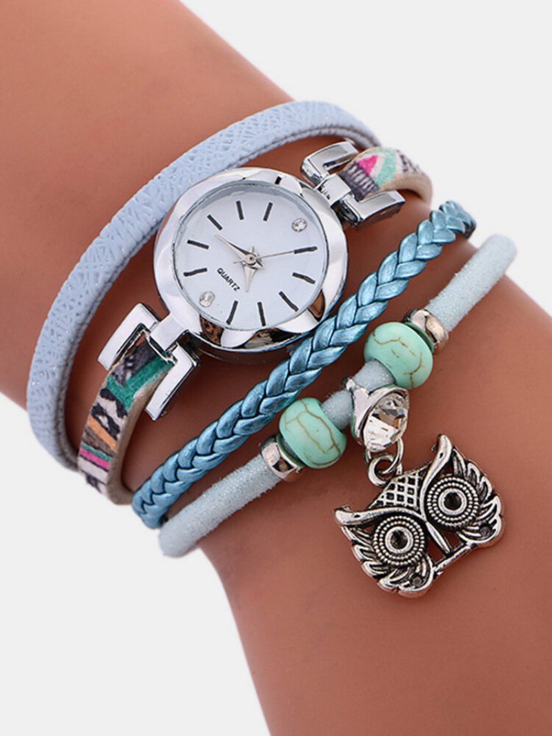 Bohém Aranyos Bagoly Bőr Karkötő Óra Etnikai Fém Strasszos Többrétegű Karórák