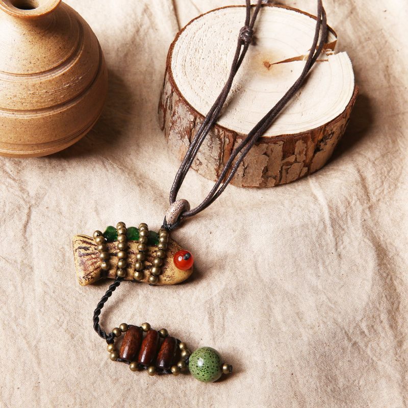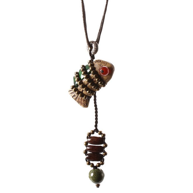 Etnikai Ékszerek Vintage Finom Hal Medál Kerámia Réz Gyöngyök Nyaklánc Hosszú Pulóver
