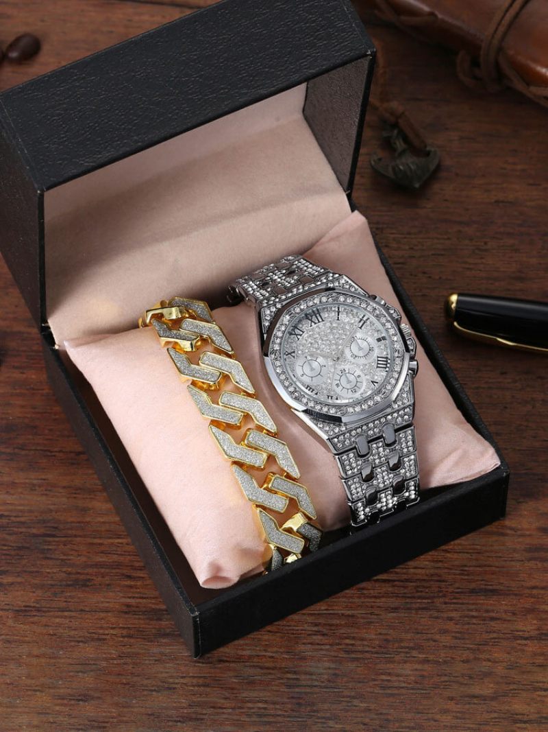 Hip-hop Dekoratív Számlap Vízálló Acélpánt Kvarc Óra Teljes Strassz Karkötő Készlet