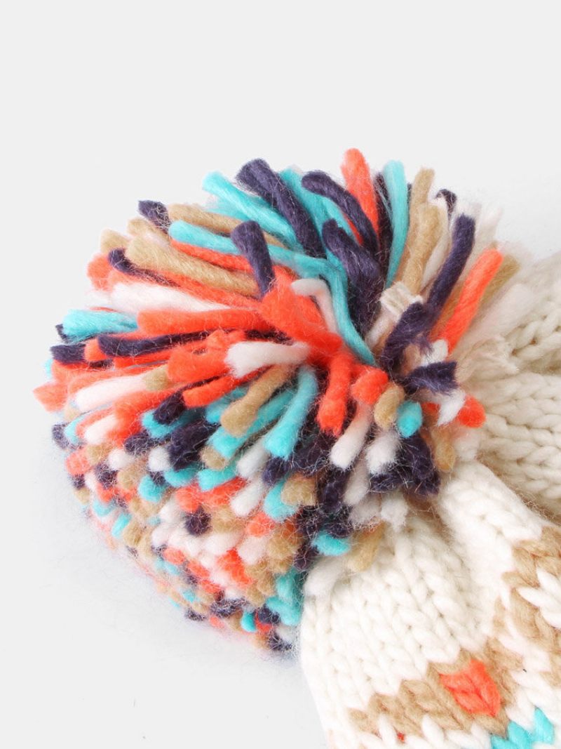 Női Kötött Vastagított Színben Illő Geometriai Mintás Vegyes Színű Szőrmegolyó Dekoratív Meleg Karimátlan Sapka