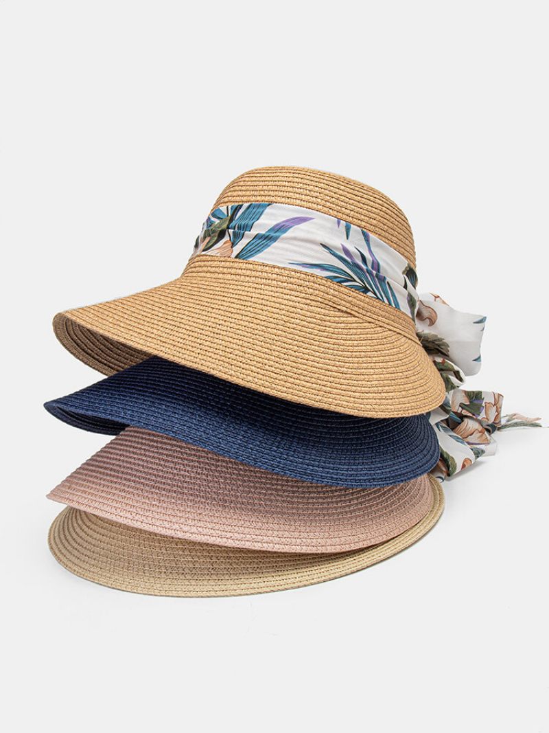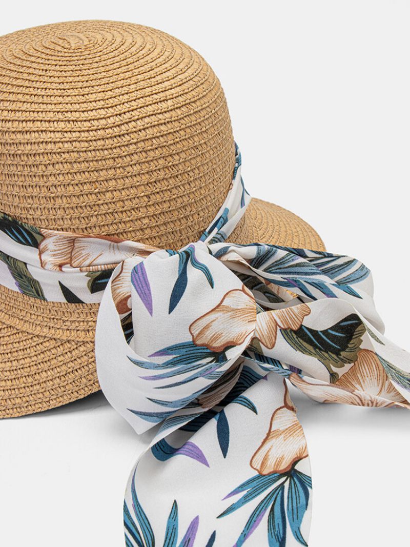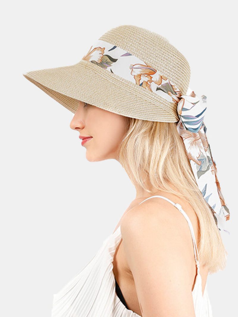 Női Straw Solid Calico Print Streamer Bowknot Decor Légáteresztő Napernyő Összecsukható Szalmakalap