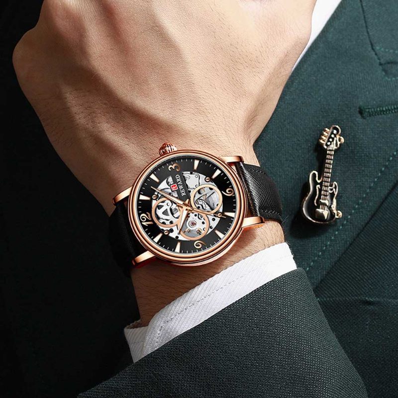Az Óra Számlapját Prémium Fémmel Kezelték A Héjon, És Megerősített Ásványi Üveggel Az Óra Borításán, Hogy Megvédje Az Órát A Portól, Víztől És Egyéb Szennyeződésektől. A Mechanikus Mozgás A Pontos Idő És A Kiváló Teljesítmény Biztosítására Épül Fel. A Valódi Bőrből Készült Óraszíjat Hosszú Távú Viselésre Tervezték, Kényelmetlenség Nélkül.