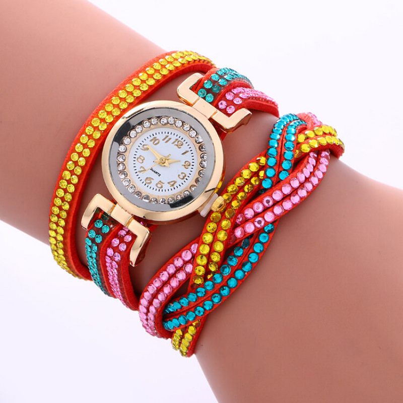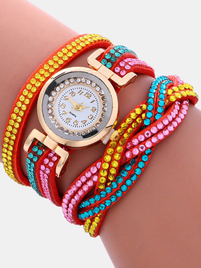 Vintage Fluoreszkáló Strasszos Többrétegű Óra Fém Színes Gyémánt Kézzel Szőtt Kvarc Óra