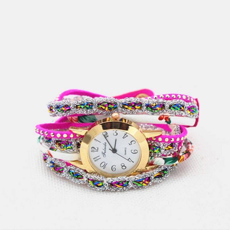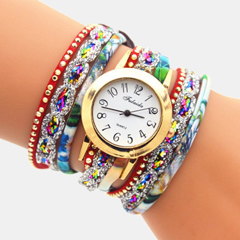 Vintage Színes Nyomtatás Többrétegű Karóra Fém Strasszból Készült Pu Kvarc Óra