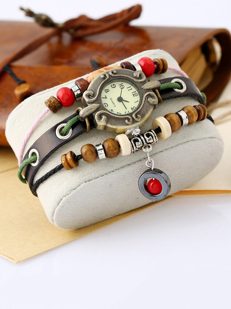 Vintage Többrétegű Női Kvarc Óra Állítható Bőr Gyöngyös Karkötő Karóra